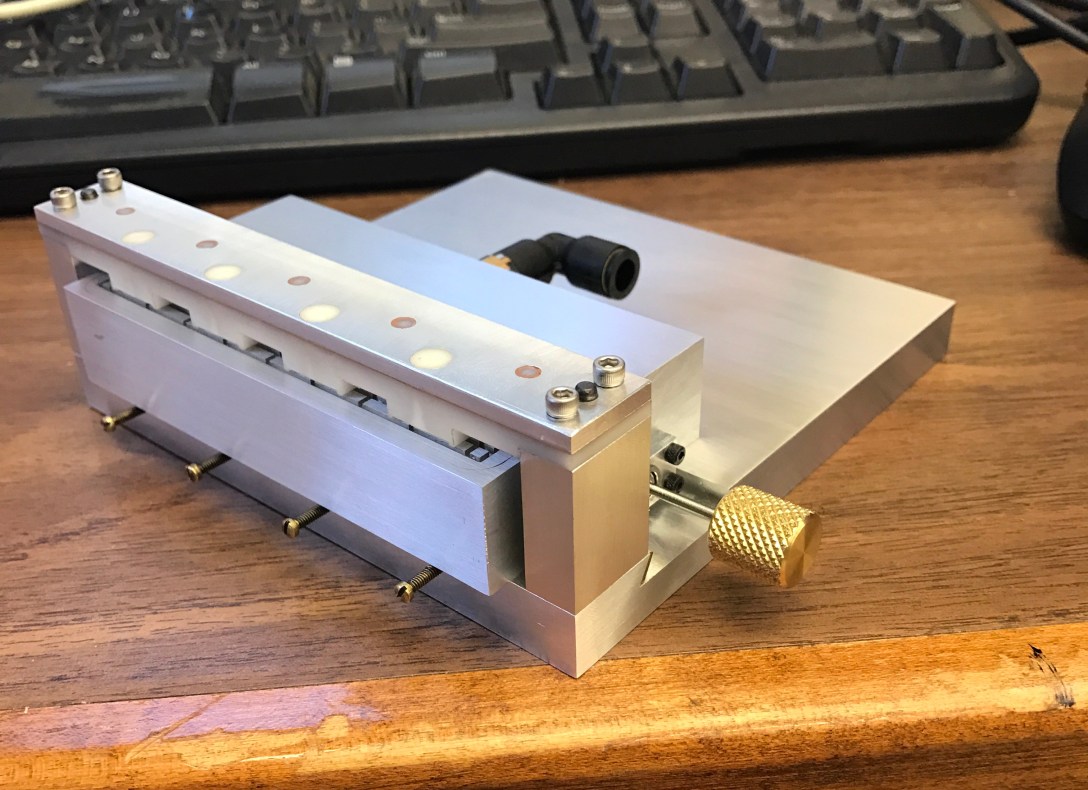 This fixture was supposed to much more complicated, with movement in 3 axis and a vacuum system to locate and secure the ASICS to be bonded to the flex-circuit. Because electrical tests needed to move forward to design was simplified significantly in order to reduce manufacturing time.